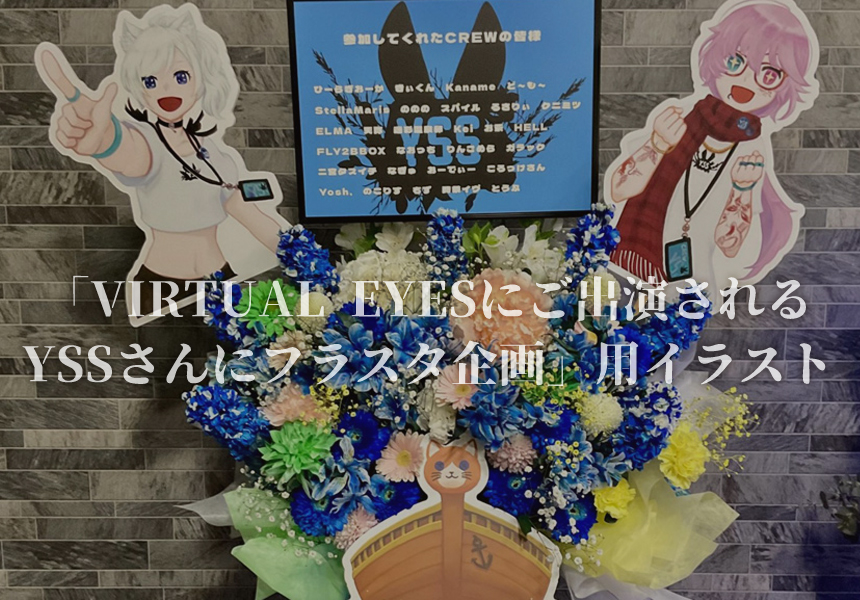 VSinger 「VIRTUAL EYESにご出演されるYSSさんにフラスタ企画」用イラスト 2025-03-162025-03-16Tasuichi Sorteさん yopi先生 CREW CAT SHIP 3月15日に開催された音楽イベント「VIRTUAL EYES」に出演されたYSSに贈るフラワースタンド用のイラストを描かせていただきました。 製作期間(依頼受注から納品まで) 約11日使用ツール CLIP STUDIO PAINT、Adobe Photoshop CS5.1
